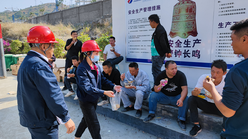 通過近日對施工班組的了解,為確保大江截流的目標(biāo)按期實(shí)現(xiàn),工人們中午、晚上用餐都是送到施工現(xiàn)場簡單解決,11月9日,機(jī)關(guān)第一黨支部組織了以“工人在加班,我為工人送加餐”的主題黨日活動,組織支部黨員、預(yù)備黨員、入黨積極分子、志愿服務(wù)者共15人到導(dǎo)流明渠施工現(xiàn)場,慰問在施工現(xiàn)場加班加點(diǎn)的一線工人,為他們送去了雞腿、蘋果等慰問品。